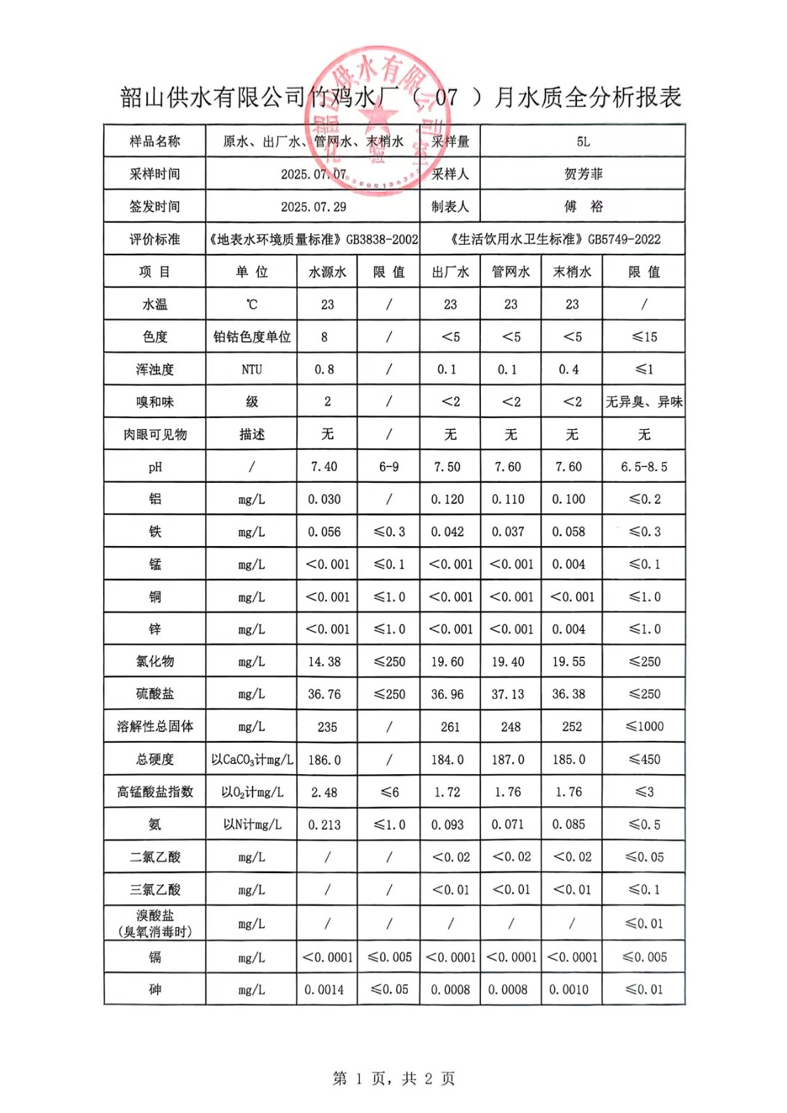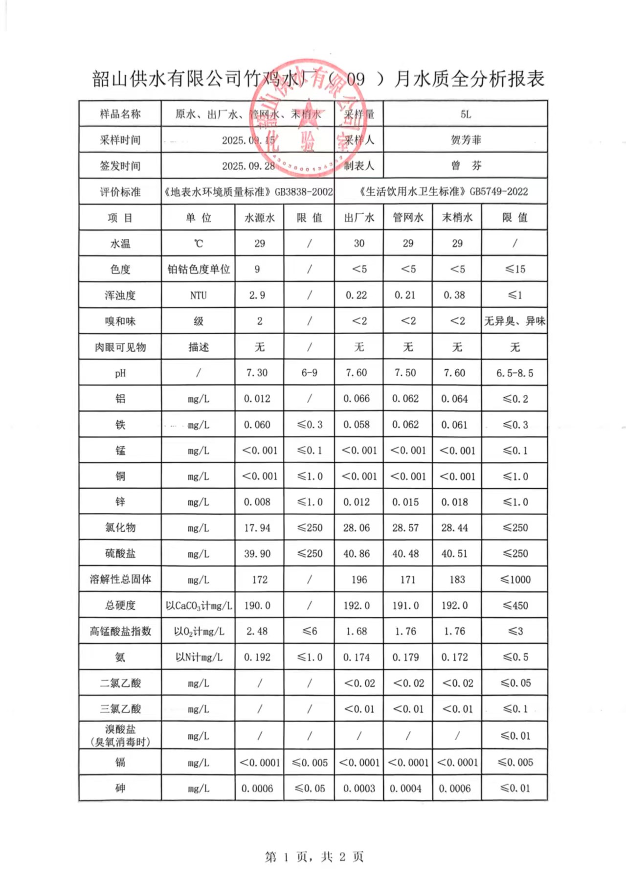 韶山供水有限公司竹鸡水厂(09)月水质全分析报表