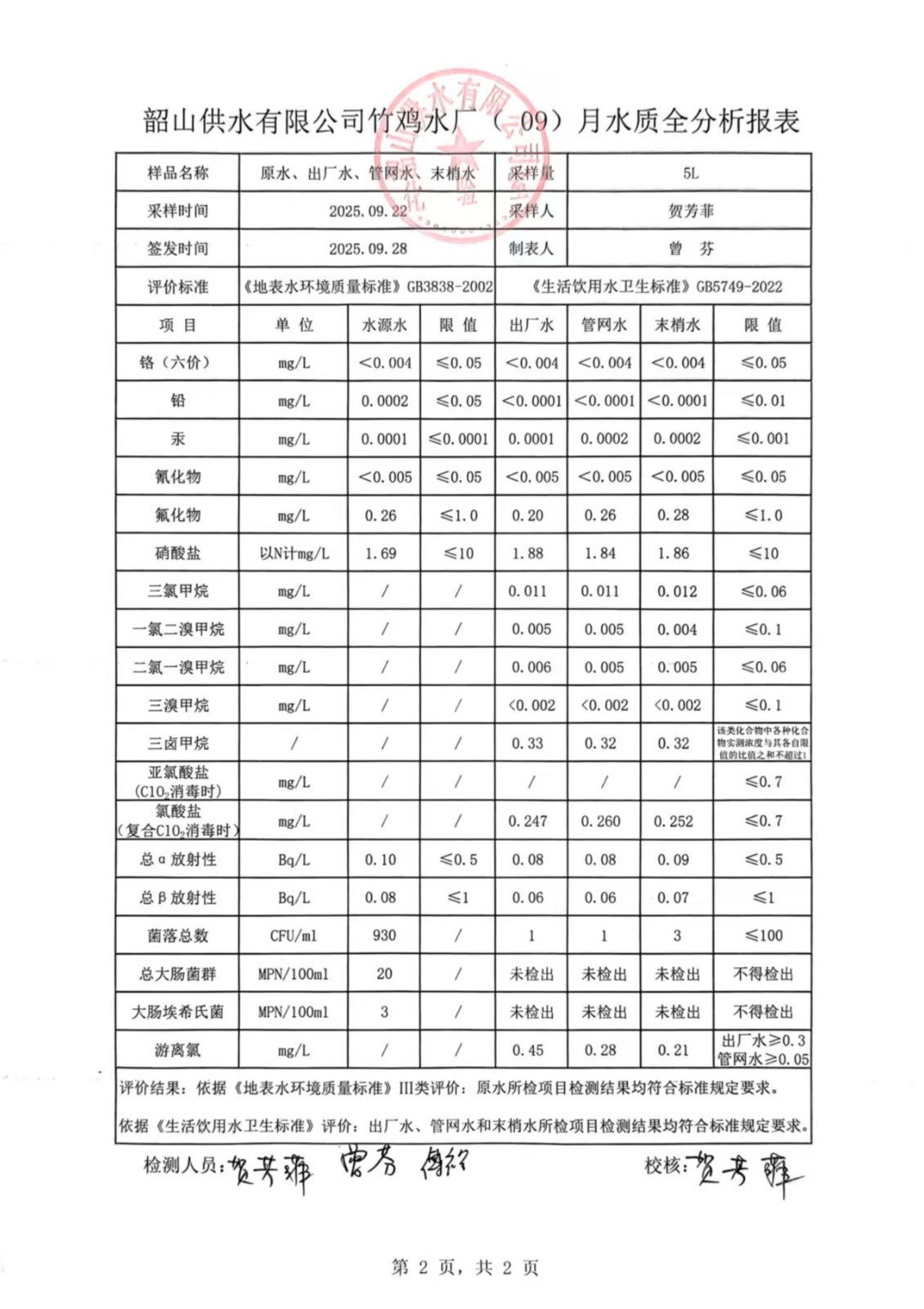 韶山供水有限公司竹鸡水厂(09)月水质全分析报表