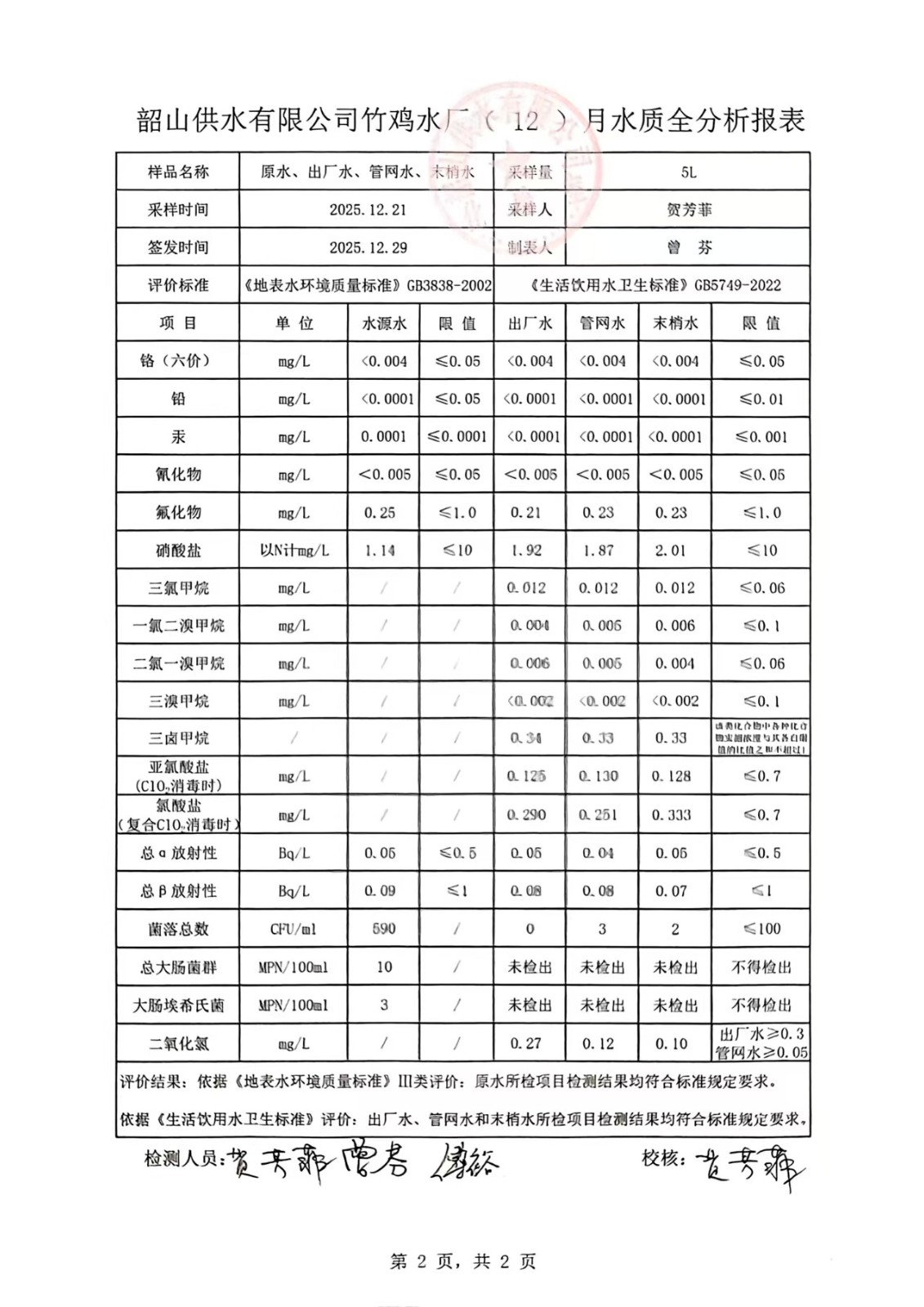 韶山供水有限公司竹鸡水厂(12)月水质全分析报表