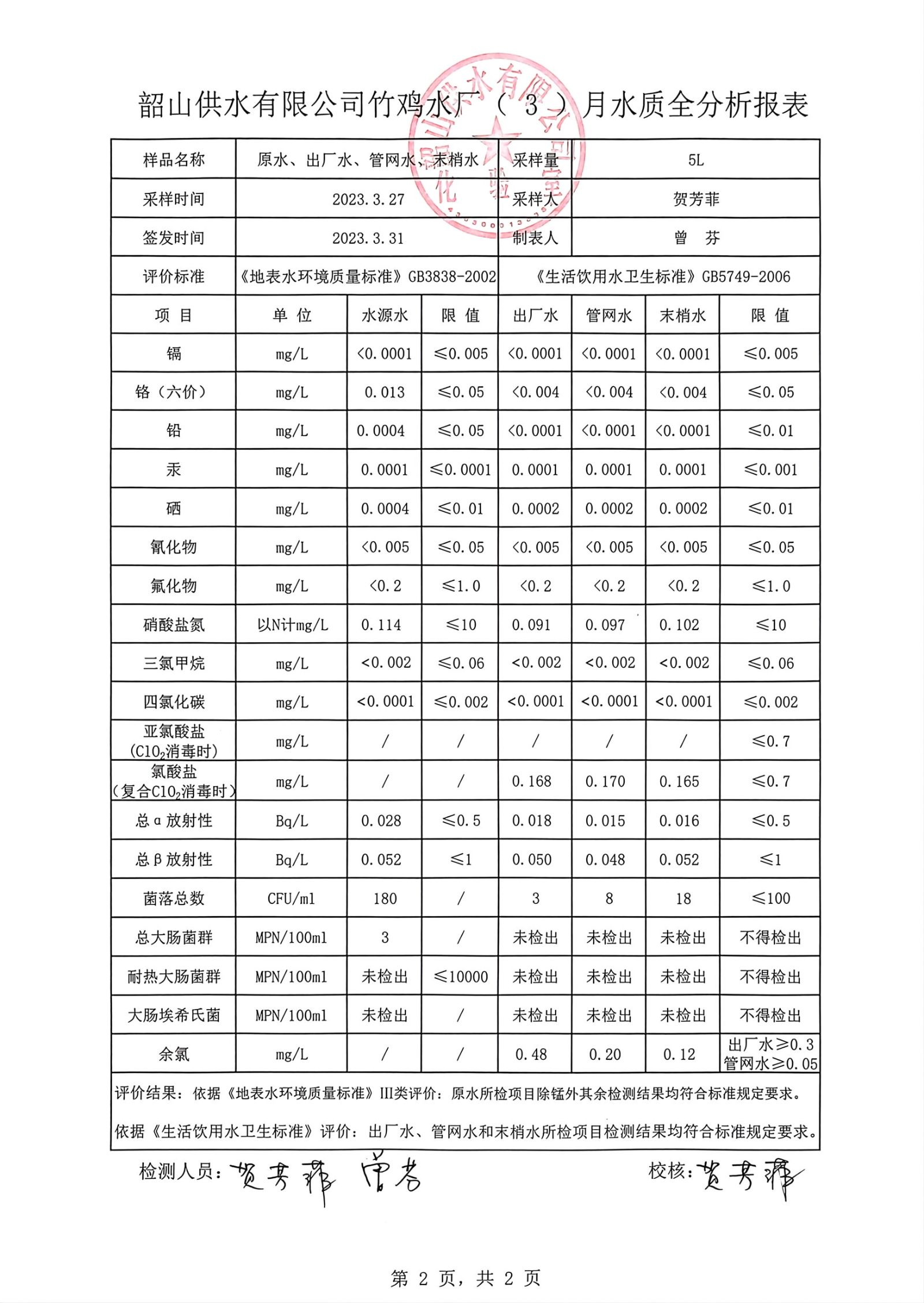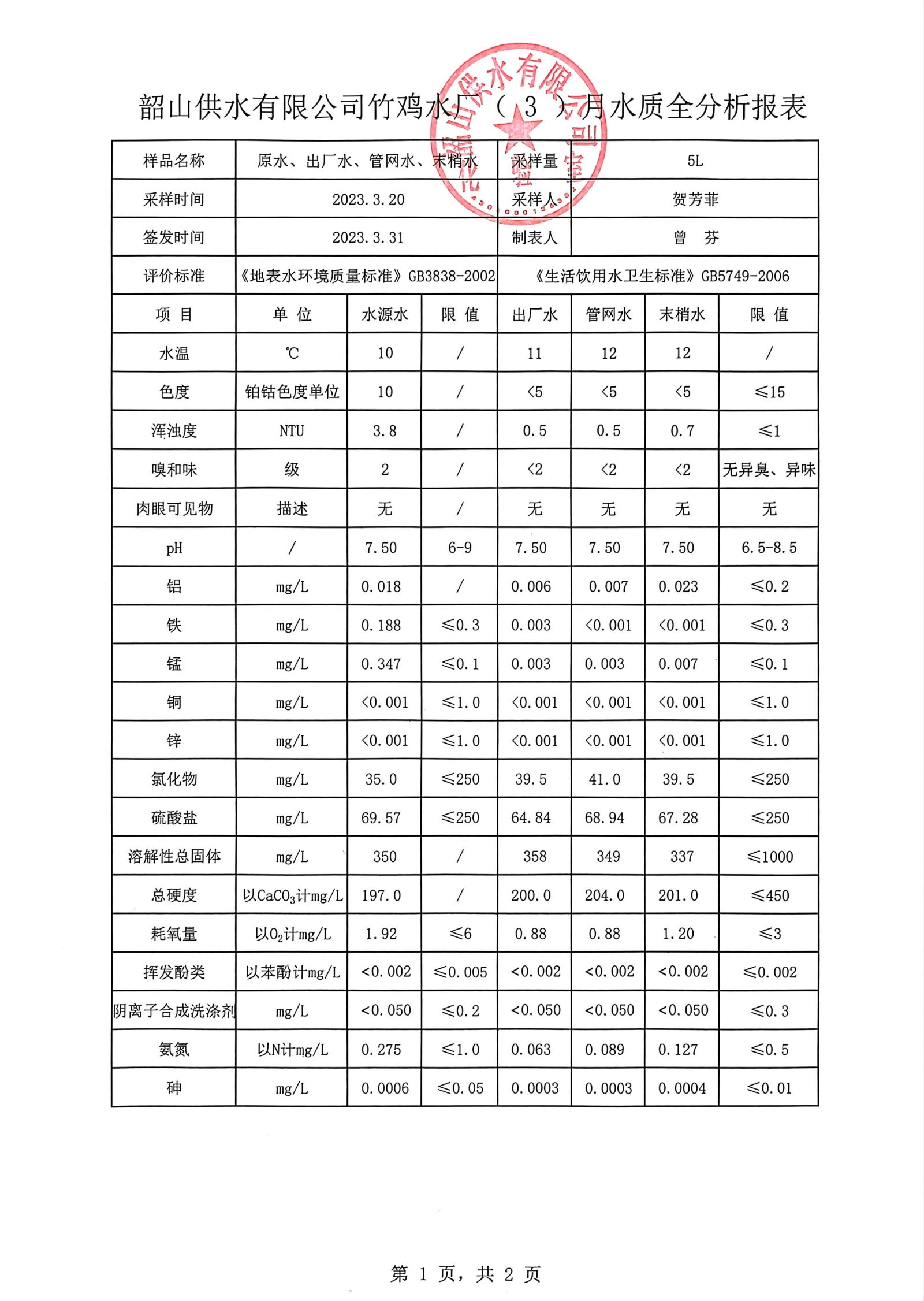 韶山供水有限公司竹鸡水厂(3)月水质全分析报表