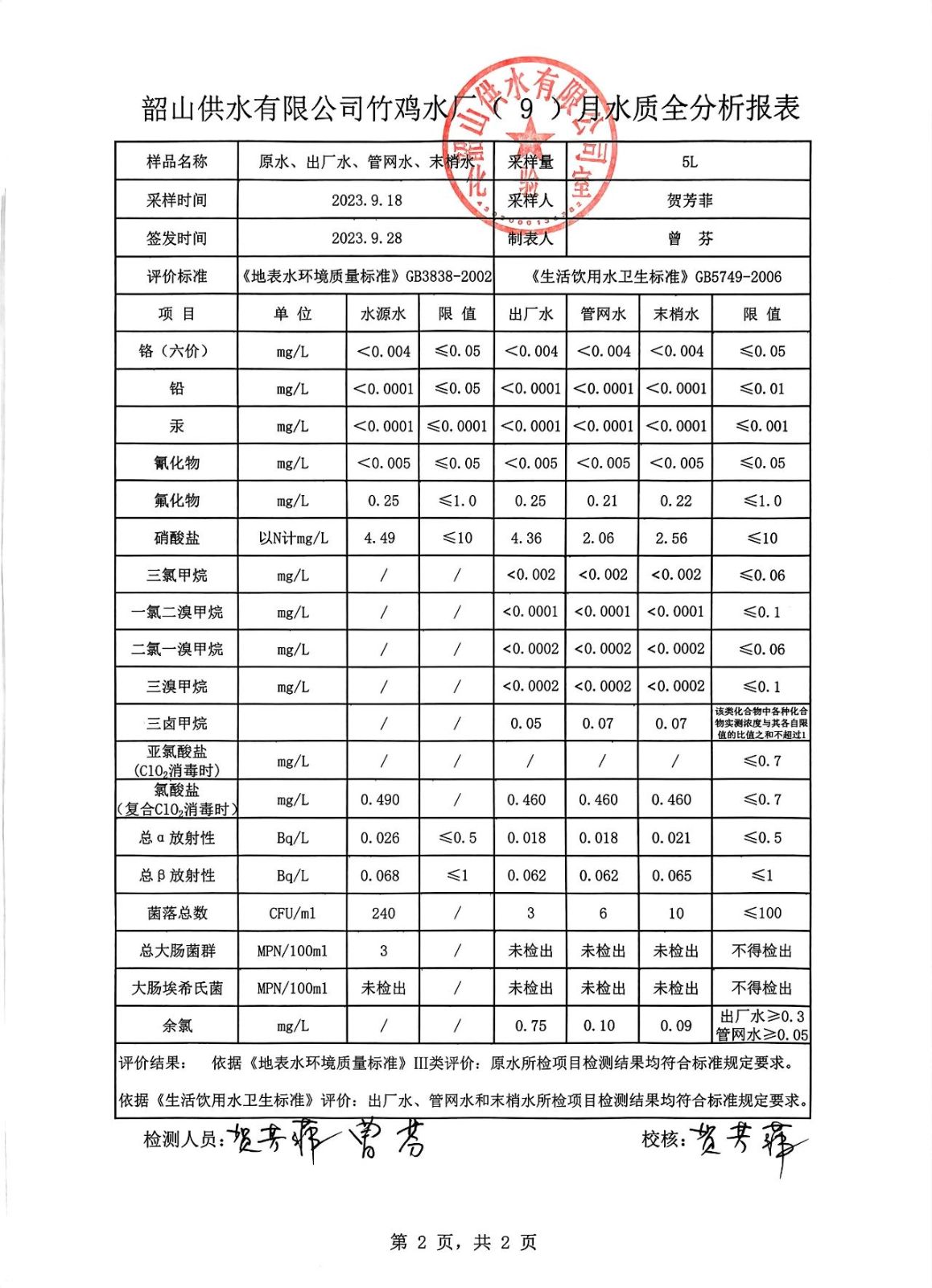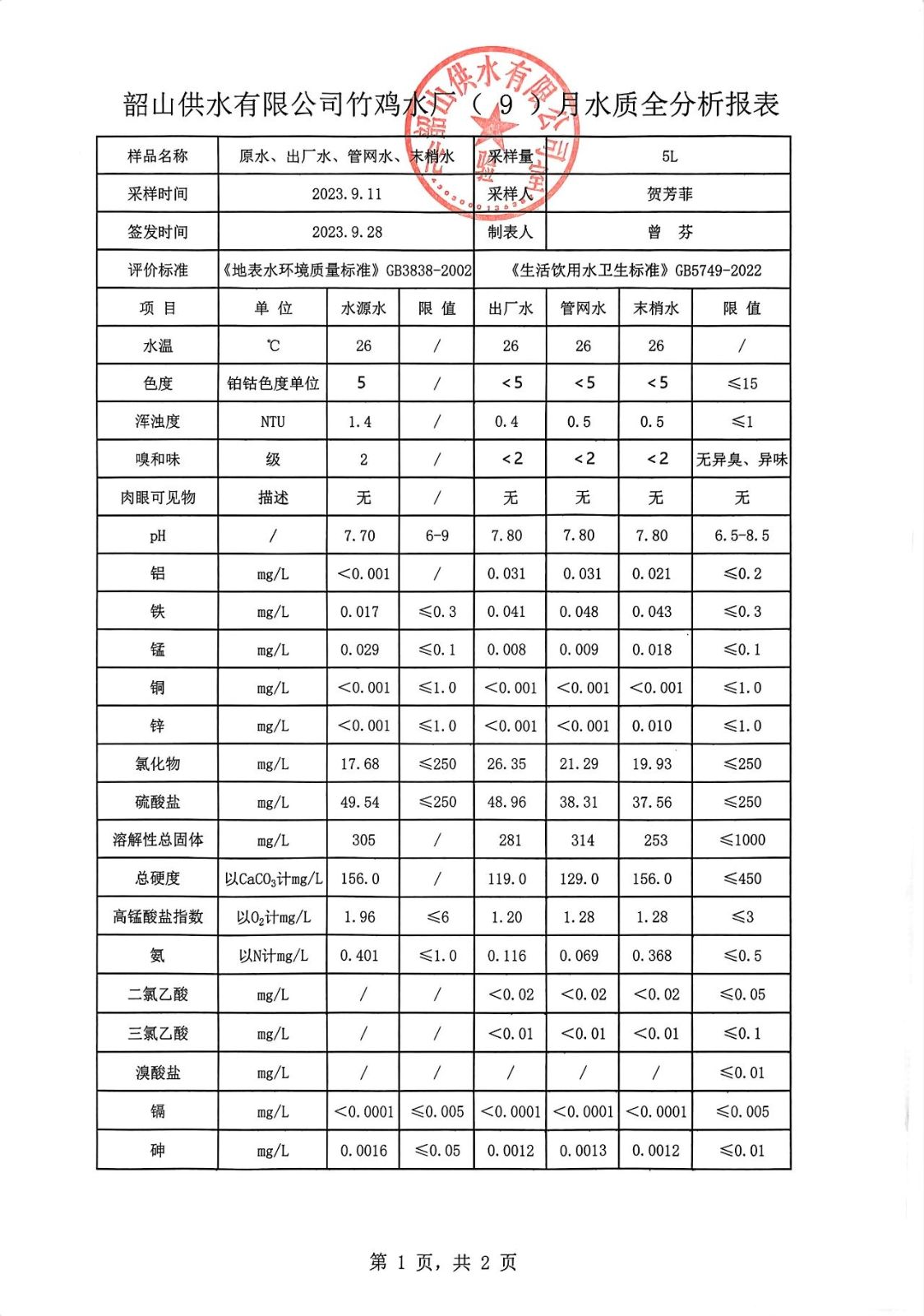 韶山供水有限公司竹鸡水厂(9)月水质全分析报表