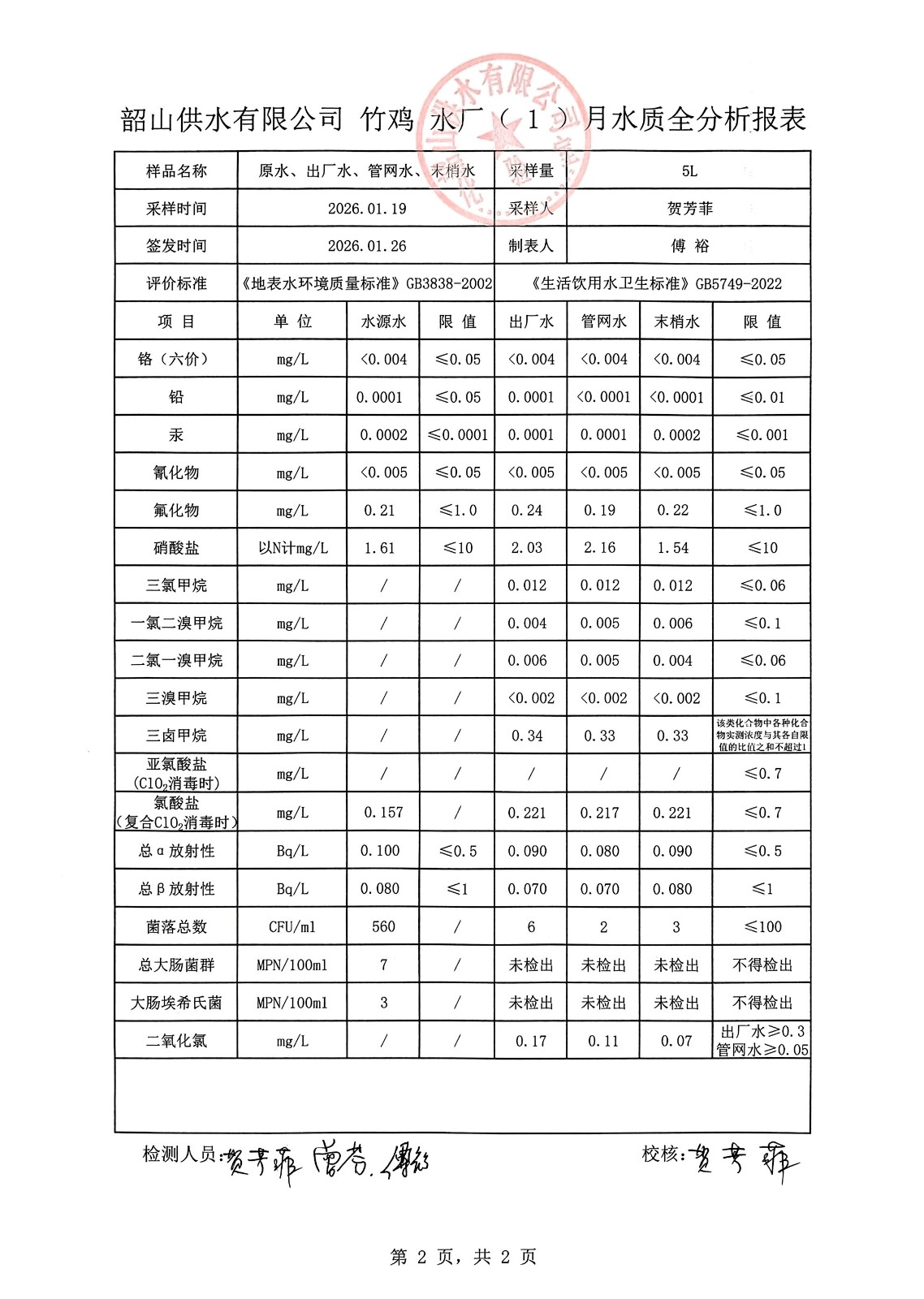 韶山供水有限公司竹鸡水厂2026年(1)月水质全分析报表