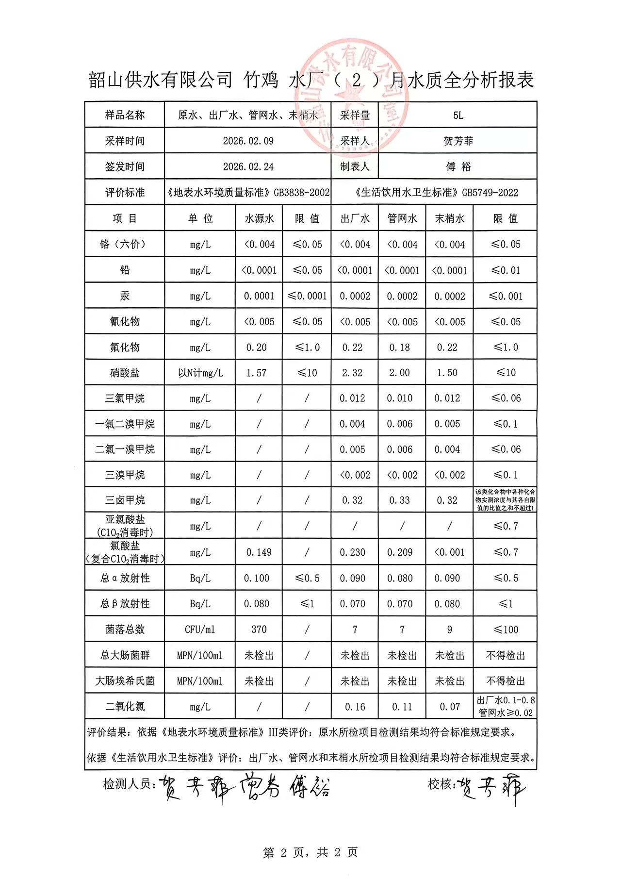 韶山供水有限公司竹鸡水厂2026年(2)月水质全分析报表